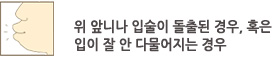 µ¹ÃâÀÔÀº ¾Õ´Ï¿Í ÀÔ¼úÀÌ ¾ÕÀ¸·Î ³ª¿Â °ÍÀ» Ç¥ÇöÇÏ´Â ¸»ÀÔ´Ï´Ù. Ȱ¡³ µíÇÑ À̹ÌÁö¸¦ ÁÙ ¼ö ÀÖ°í, ÀÔ¼úÀ» ´Ù¹°±â ¾î·Á¿ö ±¸È£ÈíÀ» Çϱ⵵ Çϸç ÀÔÀ» ´Ù¹°·Á°í Çϸé ÀÔ¼ú°ú ÅÎ ³¡¿¡ °úµµÇÑ ÈûÀÌ µé¾î°¡°Ô µË´Ï´Ù. µ¹ÃâÀÔ¿¡µµ Á¾·ù°¡ ÀÖÀ¸¸ç °ñ°Ý¹× Ä¡¾ÆÀÇ »óÅ¿¡ µû¶ó ¹«Åο¡ ÀÇÇÑ µ¹ÃâÀÔ, ¾ç¾ÇÀüµ¹¿¡ ÀÇÇÑ µ¹ÃâÀÔ, ´Ü¼ø Ä¡¾ÆÄ¡Á¶¼º µ¹ÃâÀÔÀ¸·Î ºÐ·ùµË´Ï´Ù. »çÁø¿¡¼ º¸½Ã´Â Áõ·Ê´Â Ä¡¾ÆÄ¡Á¶¼º µ¹ÃâÀÔÀ¸·Î ±³Á¤Ä¡·á¸¸À¸·Îµµ ÁÁÀº °á°ú¸¦ ¾òÀ» ¼ö ÀÖ´Â °æ¿ìÀÔ´Ï´Ù.