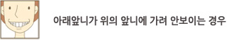 À§ ¾Õ´Ï°¡ ¼öÁ÷ÀûÀ¸·Î ¸¹ÀÌ º¸ÀÌ¸é¼ ¾Æ·¡ ¾Õ´Ï¸¦ µ¤¾î¼ Àß º¸ÀÌÁö ¾Ê´Â °æ¿ì ¾È¸ðÀÇ ¼öÁ÷Àû ºñÀ²¿¡ ´ëÇÑ ¹®Á¦°¡ µ¿¹ÝµÈ °æ¿ì°¡ ¸¹½À´Ï´Ù. ¸¸ÀÏ ¾È¸ðÀÇ ¼öÁ÷Àû ºñÀ²¿¡ ¹®Á¦°¡ ¾ø´Ù¸é ±³Á¤ÀûÀ¸·Î Ä¡¾Æ¸¦ À̵¿½ÃÄѼ À§¾Æ·¡ ¾Õ´ÏÀÇ ¼öÁ÷Àû ³ëÃâµµ¸¦ °³¼±½Ãų ¼ö ÀÖ½À´Ï´Ù.