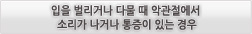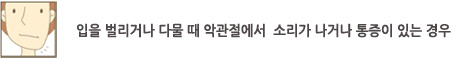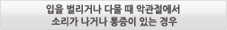 (1) ´Ü´ÜÇϰųª Áú±ä À½½Ä, ºÎÇǰ¡ Å« À½½ÄÀ» ÀÚÁÖ ¸Ô´Â °æ¿ì (2) Æò¼Ò¿¡ À̸¦ ´Ù¹°°í ÀÖ´Â °æ¿ì (À̾ǹ°±â ½À°ü) (3) ¼ö¸éÁß À̰¥ÀÌ (4) ÇÑÂÊÀ¸·Î¸¸ À½½ÄÀ» ¾Ã´Â °æ¿ì (ÆíÃøÀúÀÛ) (5) ÀÔÀ» ¿À·£ ½Ã°£µ¿¾È Å©°Ô ¹ú¸®°í ÀÖ¾ú´ø °æ¿ì (Ä¡°úÄ¡·áµî) (6) °ú·Î, ½ºÆ®·¹½º, ¼ö¸éºÎÁ· (7) ¾Õ´Ï·Î ¼ÕÅé, ÀÔ¼ú, º¼ÆæµîÀ» ¹°¾î¶â´Â ½À°üÀÌ ÀÖ´Â °æ¿ì (8) À§¾Æ·¡ Ä¡¾Æ°¡ Àß ¾È ¸Â¹°¸®´Â °æ¿ì (ºÎÁ¤±³ÇÕ) (9) ¿Ü»óÀ¸·Î ÀÎÇÑ ÅÎ ºÎÀ§ÀÇ Ãæ°Ý